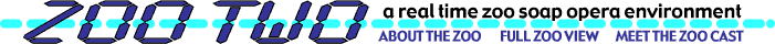 The zoo was put together by the CSSSA digital arts majors and minors during the summer session 2000 at CalArts. Each student developed an animal, created an environment and a set of icons. They developed a profile for the animal and set it's vocabulary parameters, then created dialog for the animal to use.